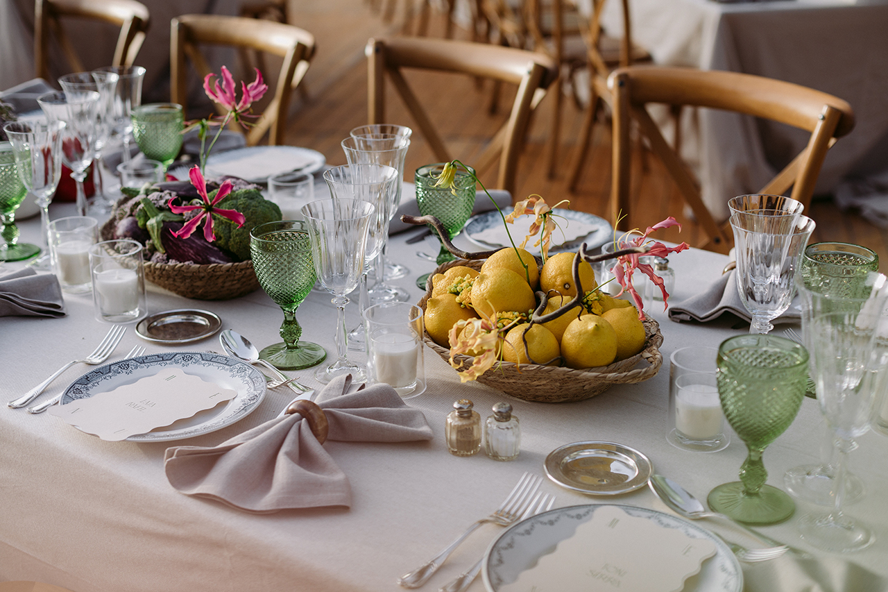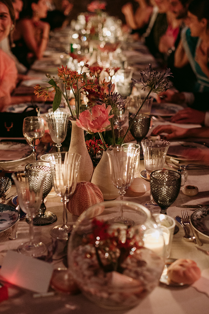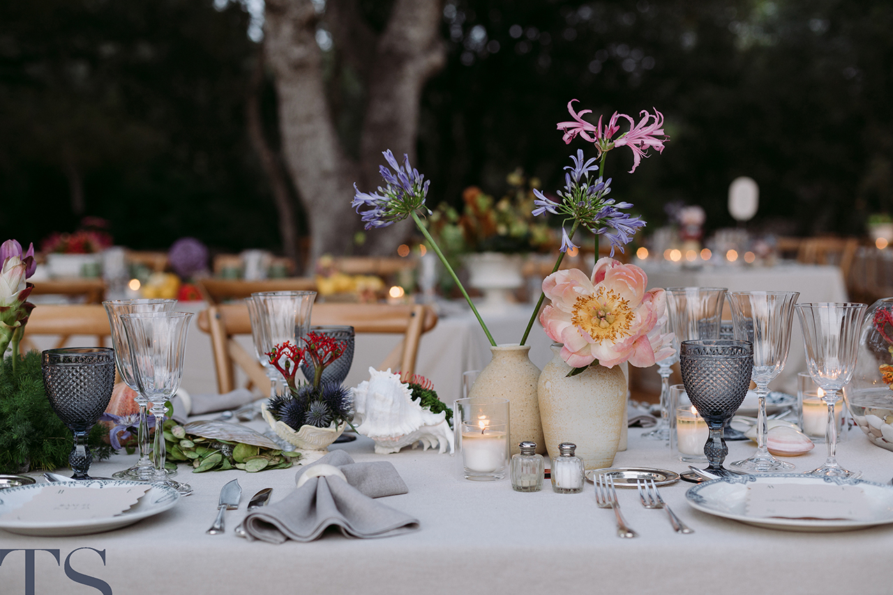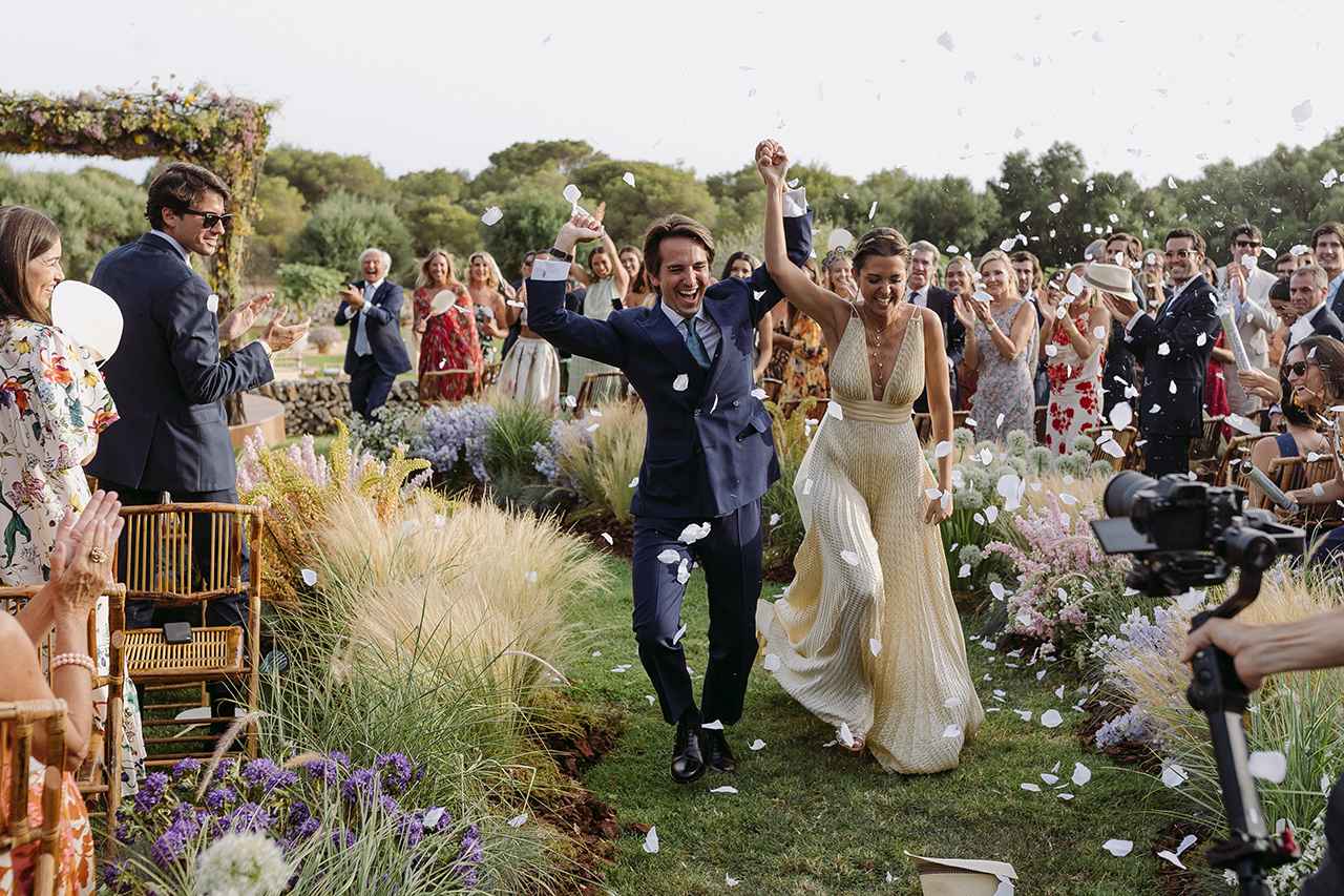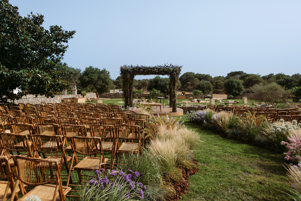 Va començar amb un aperitiu relaxat a l’ombra de les figueres menorquines, on els convidats van gaudir de la brisa suau i l’encant natural de la zona. La cerimònia va ser la protagonista gràcies al seu altar envoltat de flors fresques, creant una atmosfera de somni.