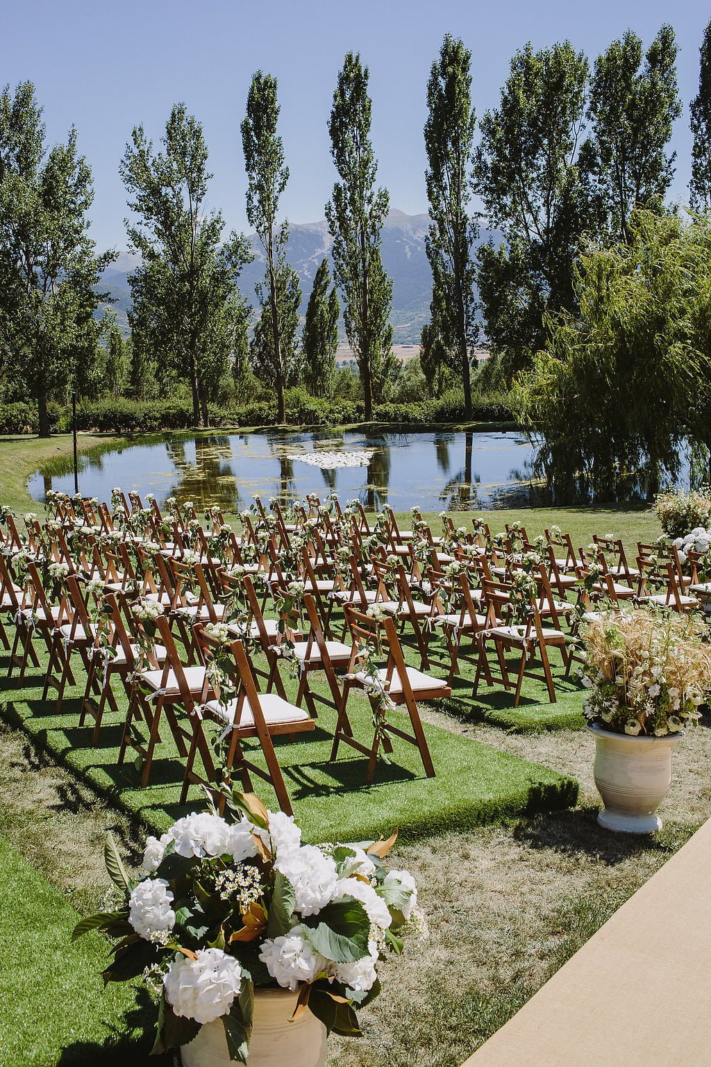 The wedding was held at the Palatchi family estate in Puigcerdà (Girona). It was a wedding full of romance and Toni Seguí's team worked tirelessly on the details to create a magical garden setting in a large marquee constructed for the occasion in the gardens of the estate. The wedding ceremony took place next to the lake in a beautiful pergola with flowers and wonderful views of the valley, where all the guests were able to see the arrival of Gabriela Palatchi in her spectacular dress, designed exclusively by Hervé Moreau, Creative Director at Pronovias.