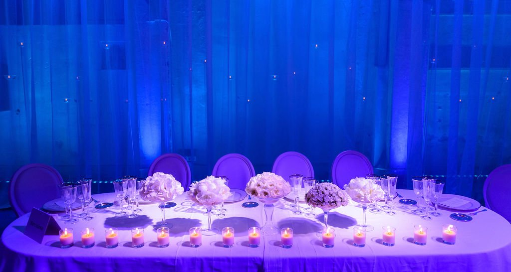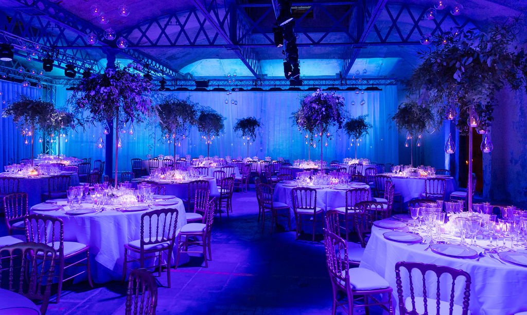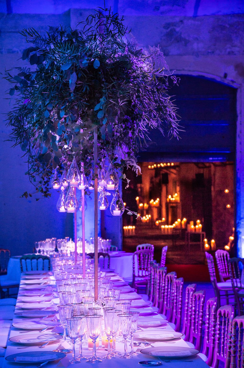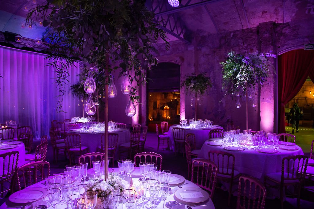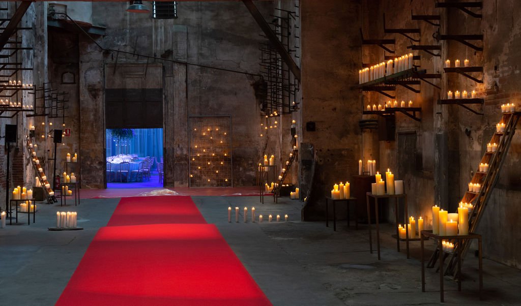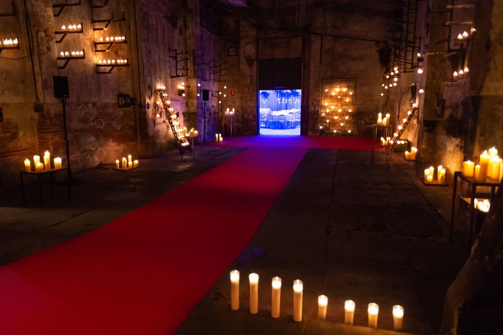 The event, a wedding in this case, took place in different areas of the venue, avoiding monotony and creating different spaces. From a radical drinks reception, but with subtle details in the yard of the warehouse, we moved on to an imposing corridor with more than 500 candles, dimmed lighting and a red carpet, adding a significant theatrical feel to the surroundings.
