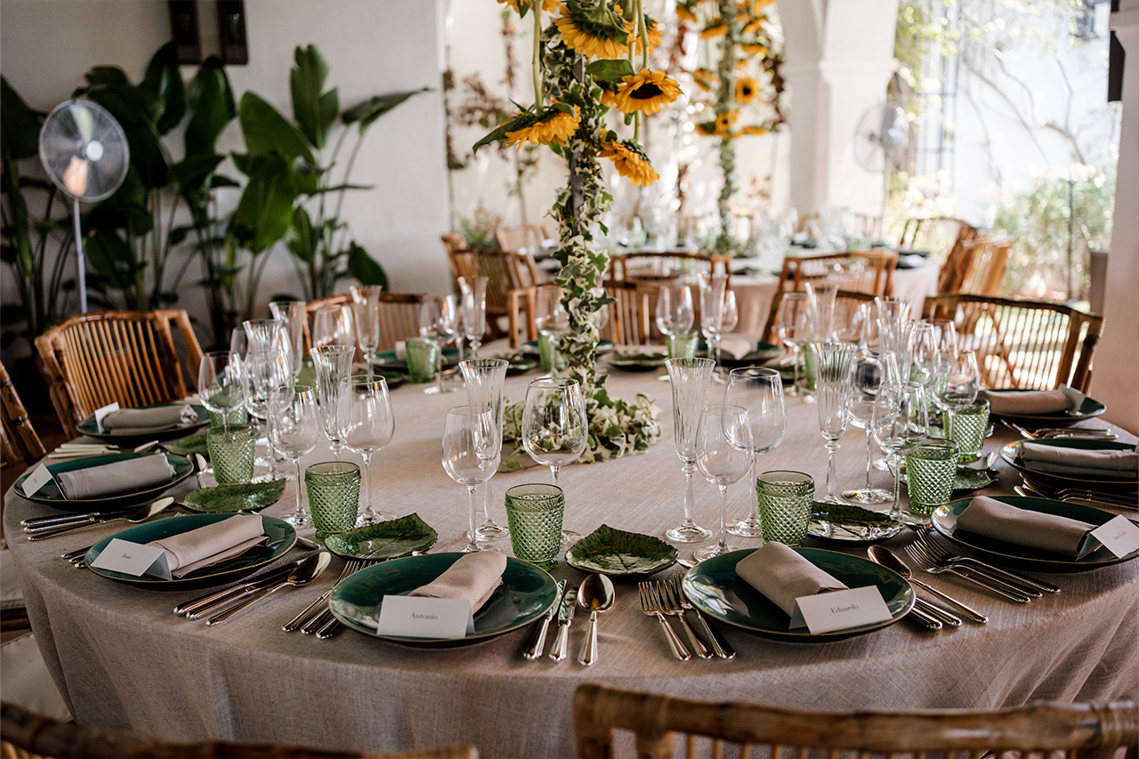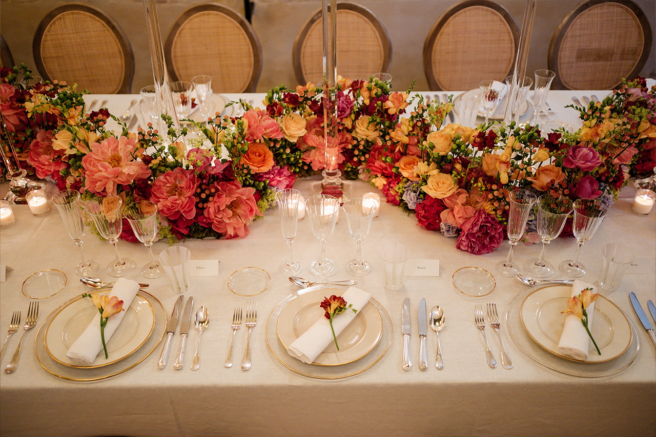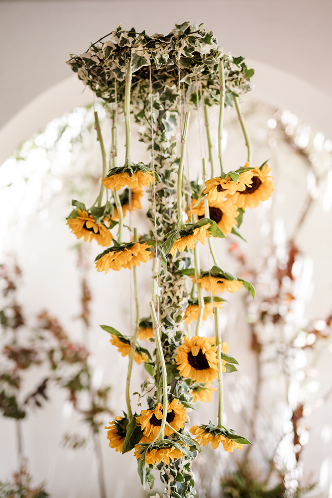 The event took place over a two day period. On the first day, a gala dinner was held, where the main table was adorned with an impressive floral display featuring peonies and roses. On the second day, an exquisite lunch was served with a touch of elegance and freshness. The perfect composition of long tables set under a sea of flowers, mainly cardoons and chamomiles, and round tables framed by a fountain of sunflowers, created a wonderfully dreamy atmosphere.