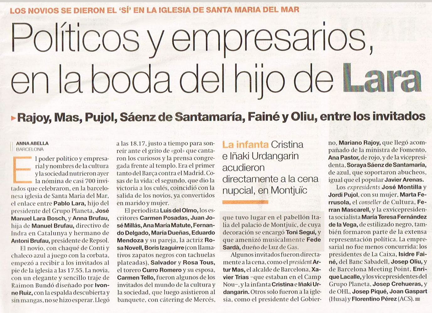 A pocos días de celebrarse la boda de Gabriela Palatchi, «El Mundo» adelantó algunos detalles del enlace, así como de la fiesta flamenca que preparamos para los novios la noche anterior a la ceremonia que se celebró en el Nàutic de Barcelona. Ver noticia completa
