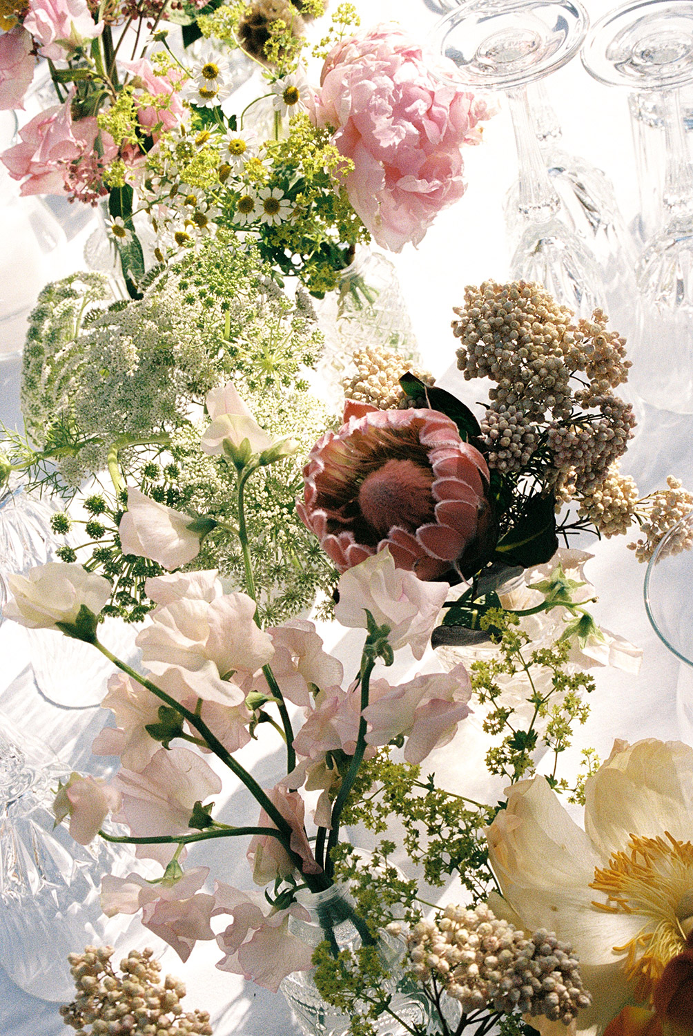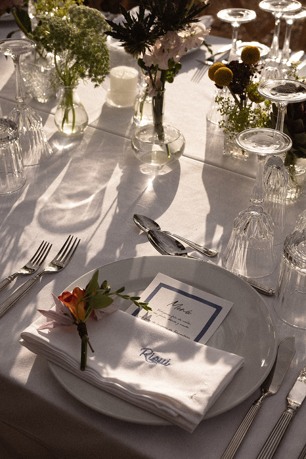La decoración se mantiene en armonía con el paisaje de la isla, utilizando centros de mesa bajos que favorecen la interacción entre los invitados. Las flores en tonos suaves, como el blanco, el rosa, el crema y el verde, aportan sensación de frescura y naturalidad.